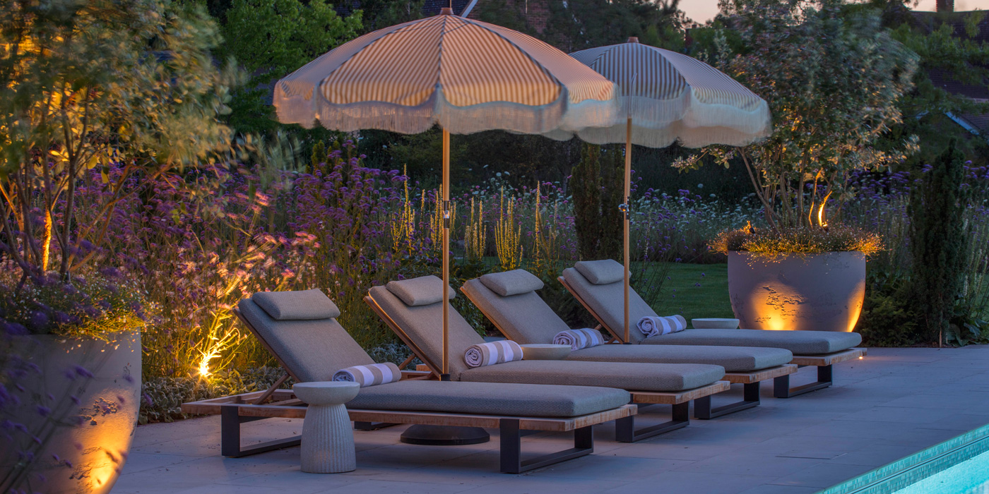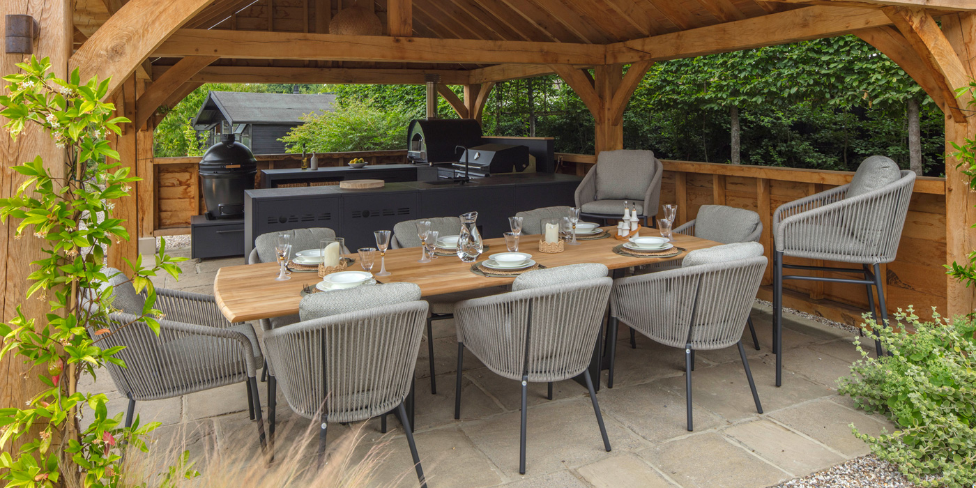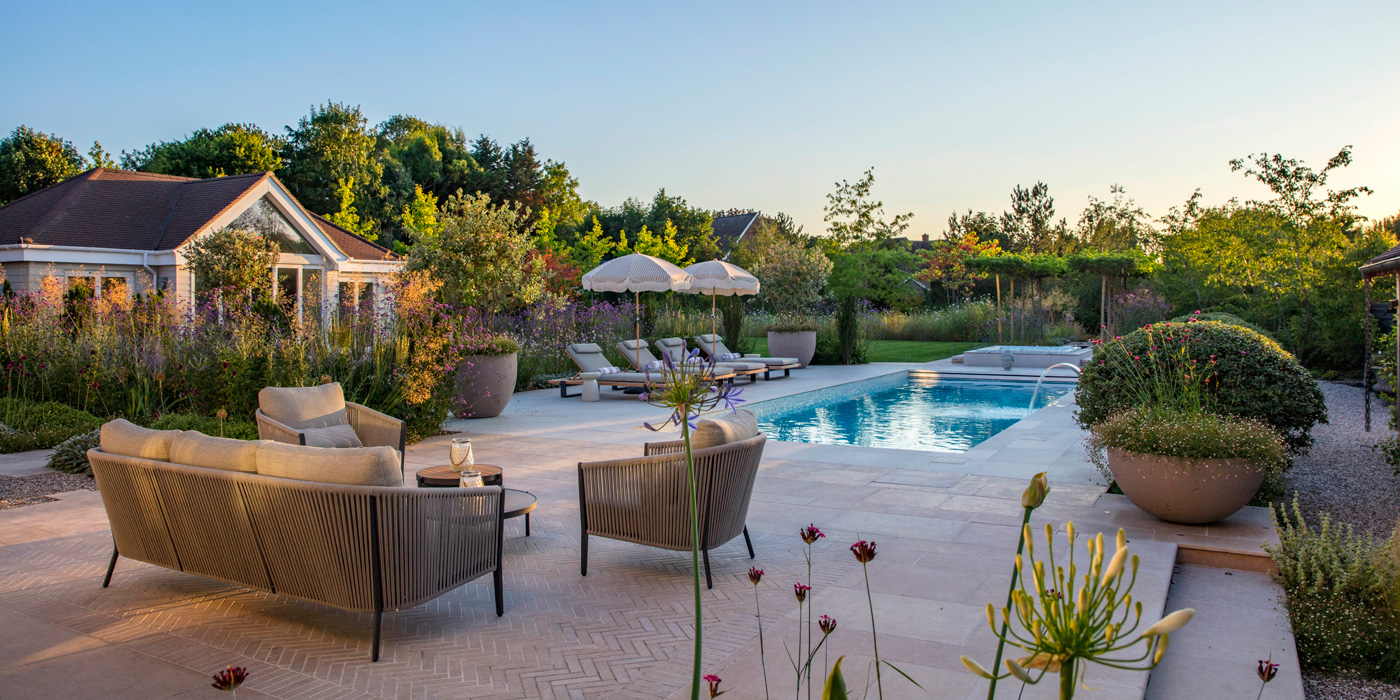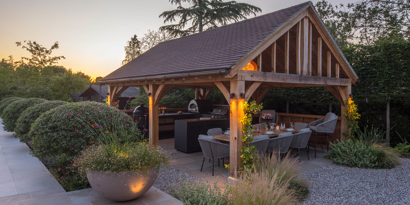 A new, relocated swimming pool built by Centurion Leisure, formed a centre point to our hard landscaped areas arranged and laid outwards from the house, associated with richly planted seating areas, poolside lounging, hot tub areas, a sunken fire pit with handcrafted Balau bench seating, and a burner. Either side of this area is flanked by garden structures with a 35m2 oak frame gazebo with a tiled roof housing an outdoor kitchen and a covered dining and seating area.