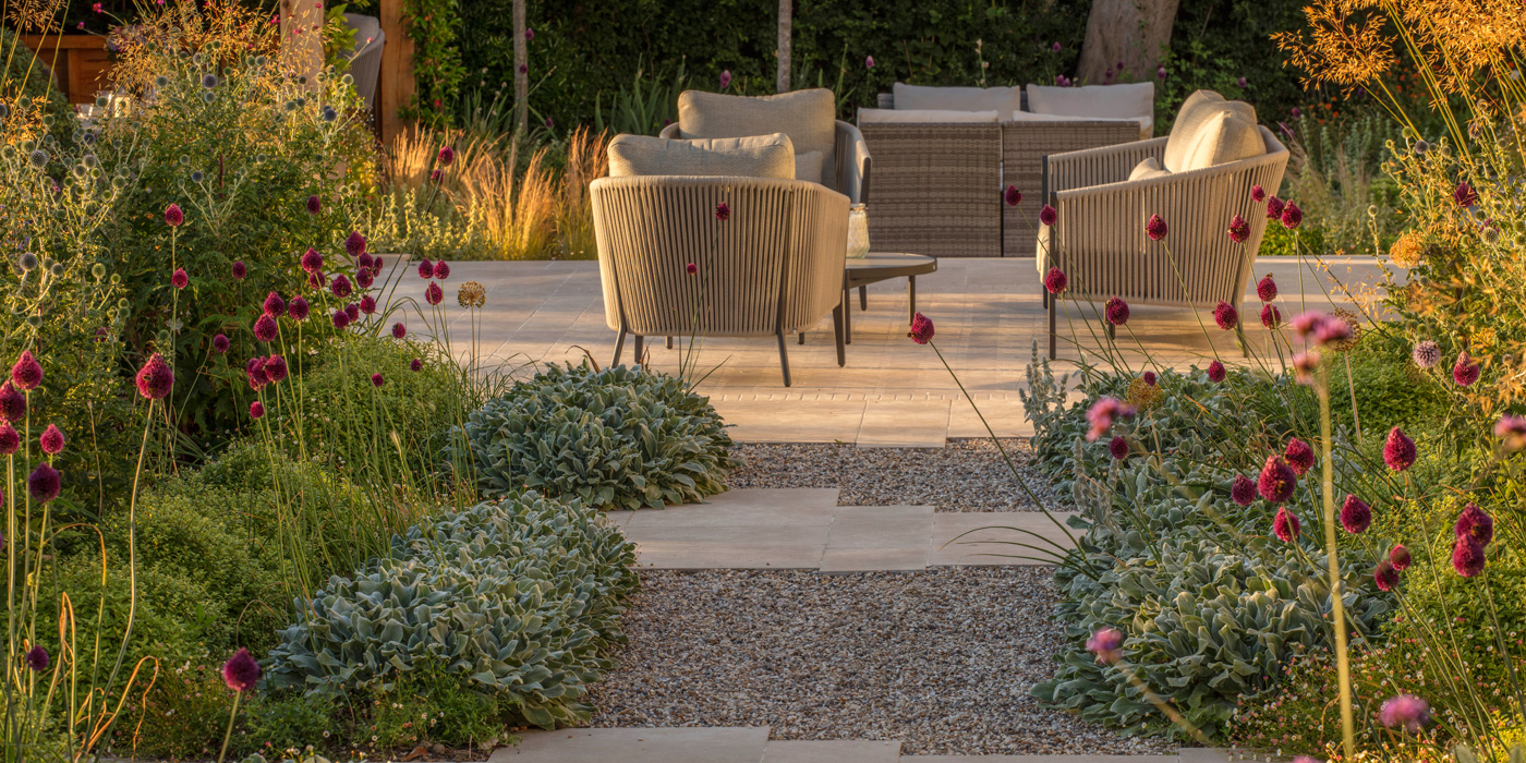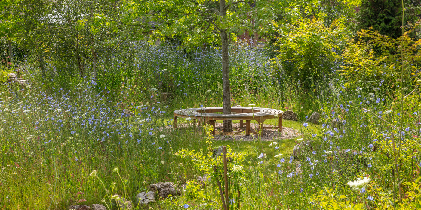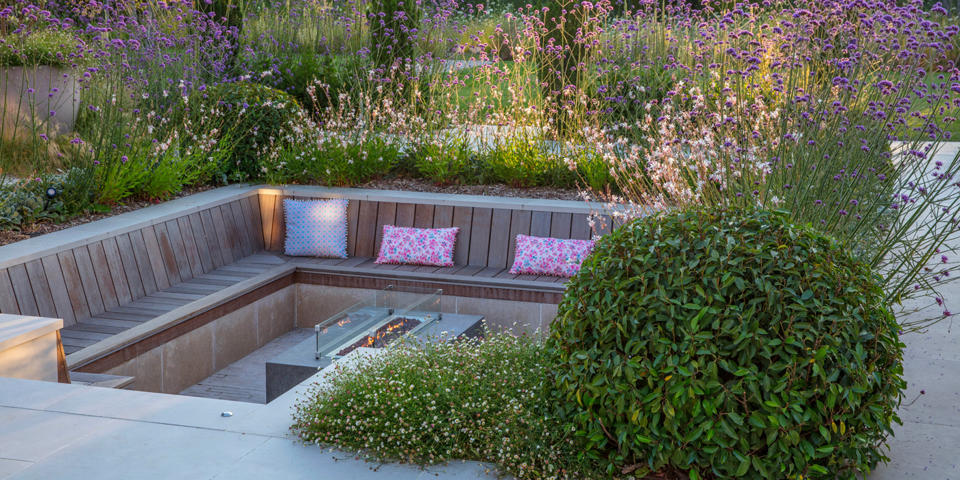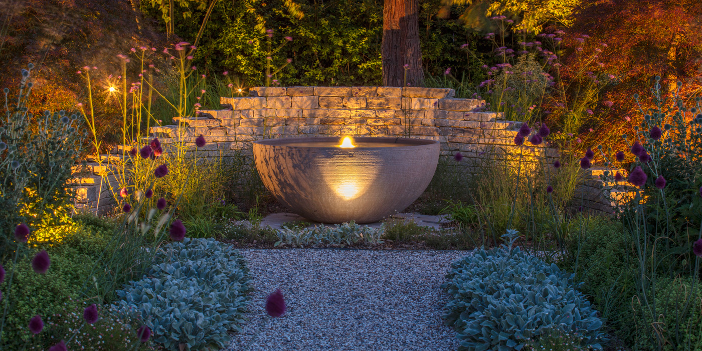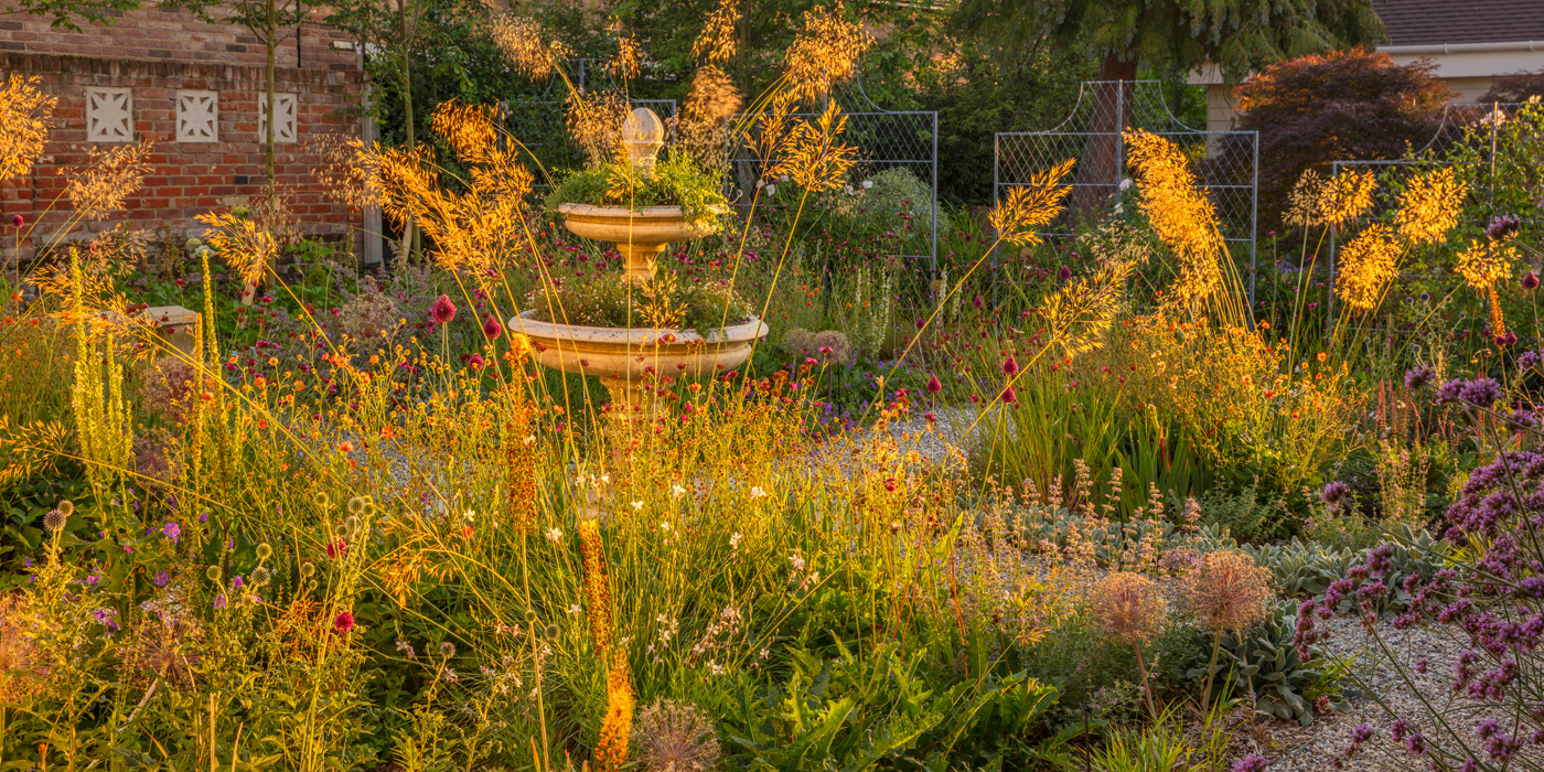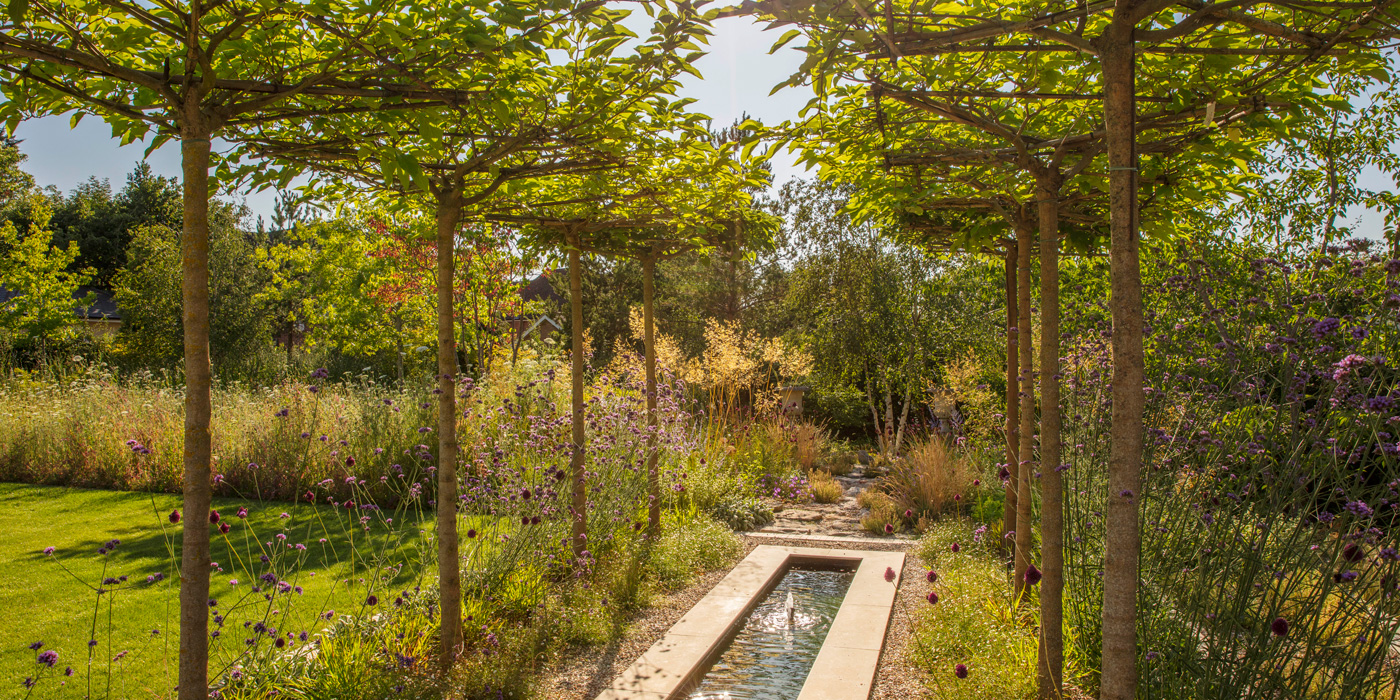 Two water features add movement and sound to the garden. The first is a 6.5m long rill with a Morus alba umbrella canopy that continues a watery axis from the swimming pool and hot tub, leading to a wildflower meadow. The rill is straddled by a gravel garden with herbaceous planting. The second water feature is a large half spherical bowl with a single water jet and a semicircular backdrop wall feature. Located to the side of the house, the feature provides a focal point from the patio seating area and leads to the gravel garden which is another distinct area adjacent to the house.
