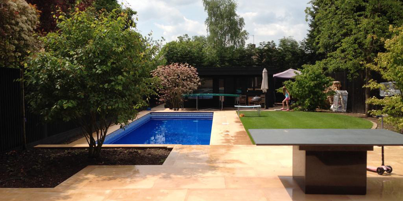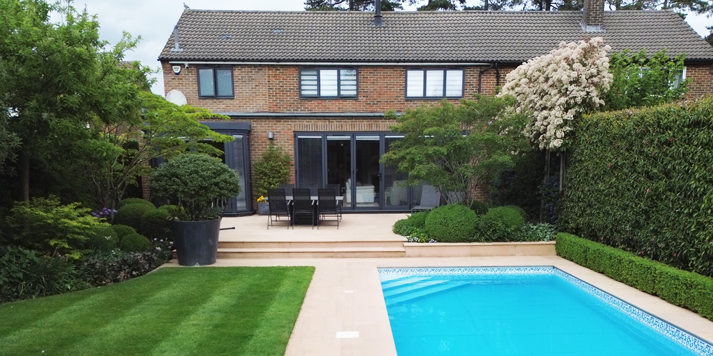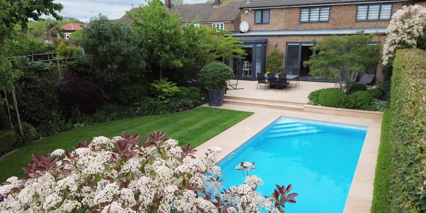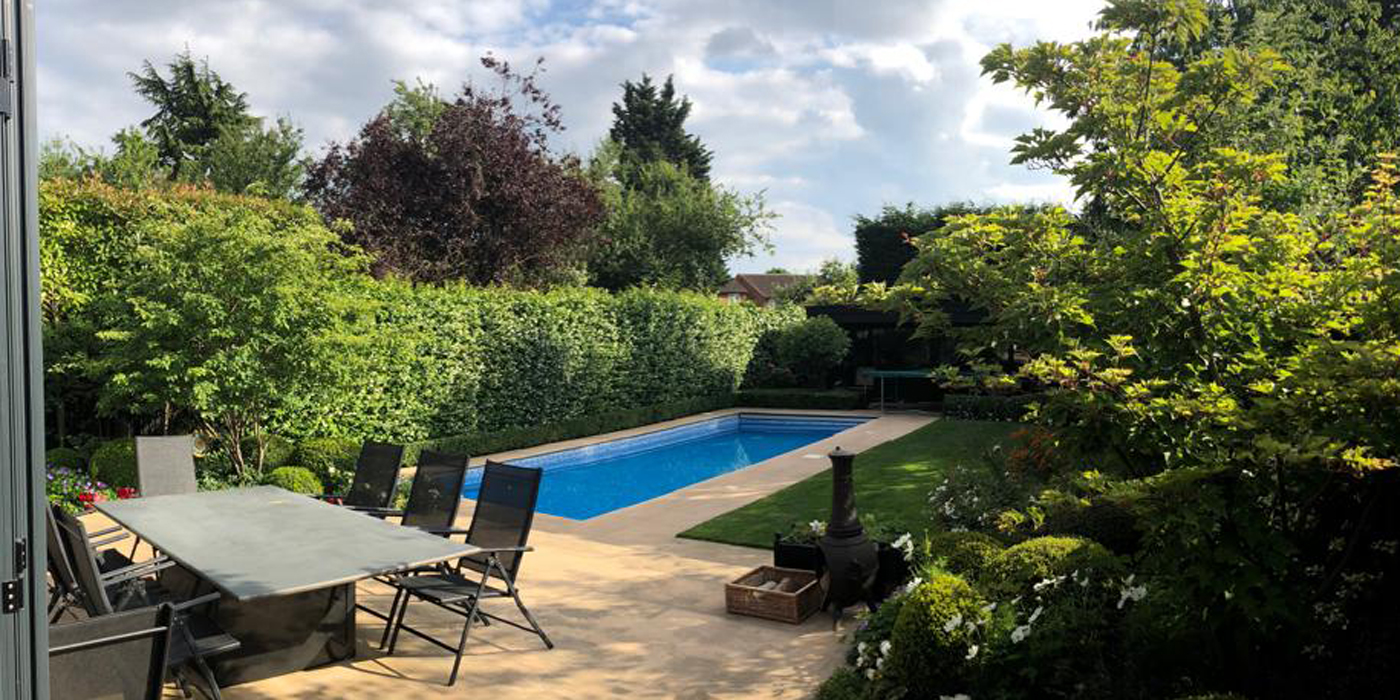 A dense hedge to the side of the swimming pool offers privacy, while a richly planted border adjacent to the lawn gradually ascends to provide privacy on the opposite side of the garden with a specimen trees dotted around.
