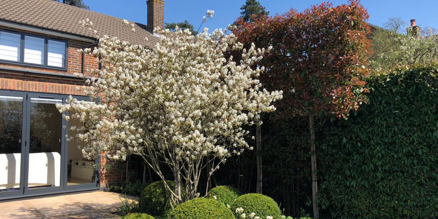 By terracing the garden over three levels we were able to create distinct spaces to accommodate modern living. Directly in front of the opening doors is an Indian sandstone patio with multi-stemmed tree specimens taking centre place in beds also featuring box clouds and a rich mix of coloured bedding plants.